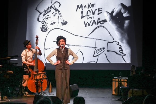 Künstler trifft Trio. Mit Live-Zeichnungen, Gassenhauern und Chansons von Marlene Dietrich, Friedrich Hollaender, der Dreigroschenoper bis hin zu den Comedian Harmonists nehmen Robert Nippoldt und das Trio Größenwahn Sie mit auf eine bild- und tongewaltige Zeitreise.